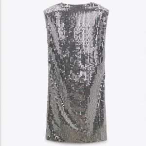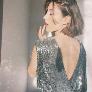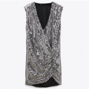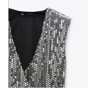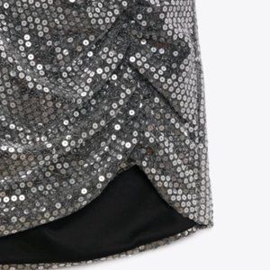ZARA DRAPED WRAP SILVER V NECK SEQUIN SHOULDER PADDED DRESS $119