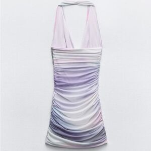 Mini halter dress with deep V-neckline. Ruched fabric. Side hidden in-seam zip closure.