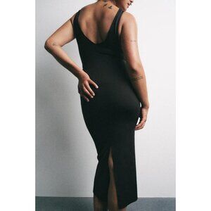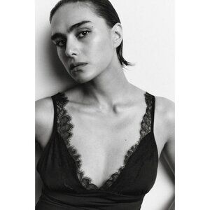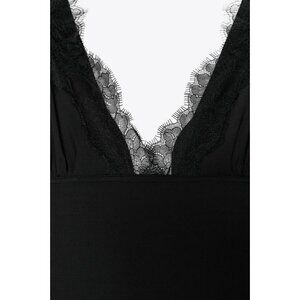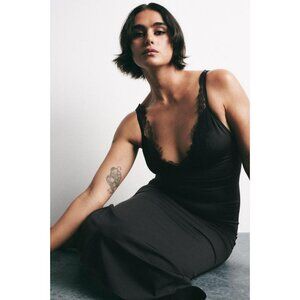 Midi dress made from a polyamide blend knit. Featuring a V-neck and wide straps. Matching lace appliqué detail. Straight hem.