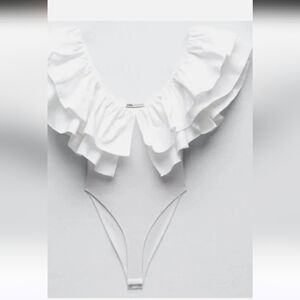 ZARA Deep V Neck Statement Ruffle Neckline One Piece Suit/bodysuit. White.SM