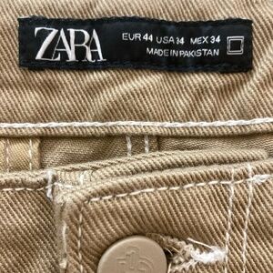 ZARA Denim Cargo Pants Topstitched Straight Drawstring Leg Brown