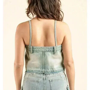 ZARA Denim Jean Cropped Pants Top Spaghetti Straps Size Large Bloggers Blue Wash