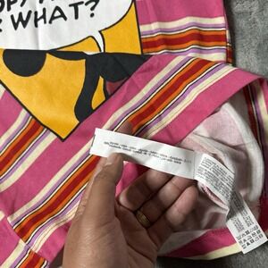 The ZARA Disney shirt for women in size small features a fun and playful design with Mickey Mouse depicted as Goofy the dog. The pink striped t-shirt has short sleeves, a crew neckline, and a pullover closure, making it perfect for casual or travel occasions. Made from 100% cotton knit fabric, this regular fit shirt is machine washable and suitable for all seasons. With its cartoon and comic theme, this designer piece from Zara is a cute addition to any wardrobe.