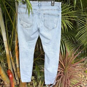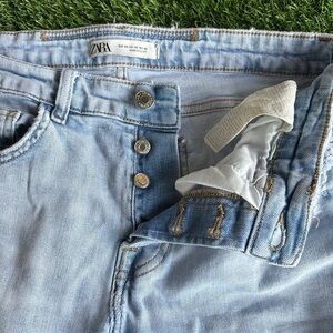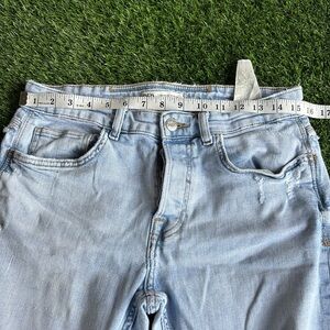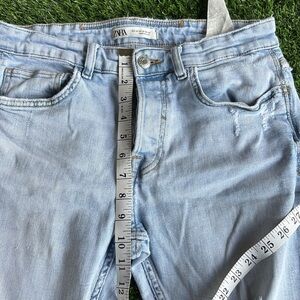 GUC Zara Distressed front & back Rise 10” Inseam 28” Button fly Light wash Size 32