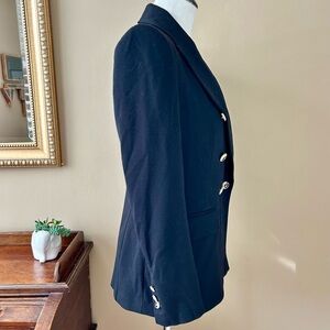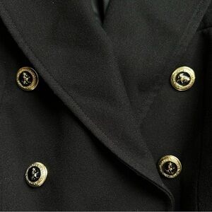 This Black Double Breasted Blazer Jacket from Zara features a gorgeous oversized double breast silhouette with structured shoulders, black and gold tone crest embossed buttons, functional buttons at the cuffs, and a wide notch collar. Fully lined. Similar to Veronica Beard styles.