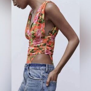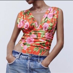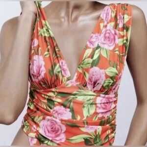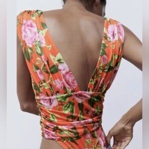 ZARA Draped Floral Deep V Plunge Bodysuit