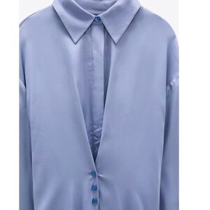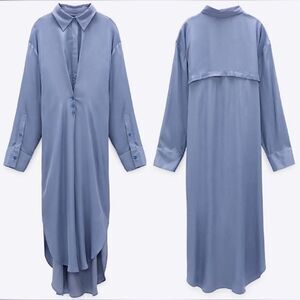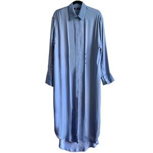 Zara Satin Effect Blue Long Oversize Collared Full Length Button Up Placket with Three Button Front Shirt Dress Size Small