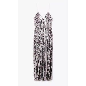ZARA Dress XS Silver Strappy Sequin Midi Party 9373/567 Prom V-Neck Sparkle