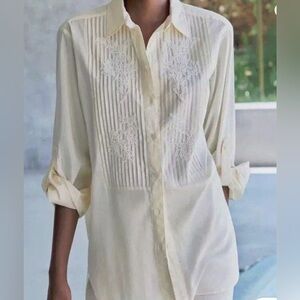 ZARA ECRU OVERSIZED EMBROIDERED BEADED FLORAL PLEATED CHEST POPLIN LONG SHIRT