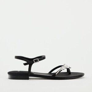 Flat sandals in satin effect fabric with thin straps. Toe post and front rhinestone embellishment. Buckled ankle strap closure.