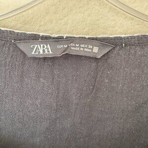 This Zara blouse is in size M with a round neck, long sleeves, and tie closure. It is made of lightweight black cotton with embroidered accents, perfect for a basic yet stylish look.