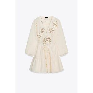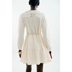 V-neck dress with long sleeves. Textured fabric detail with contrasting embroidery. Matching belt detail with tassels and beads. Inner lining. Button-up front.
