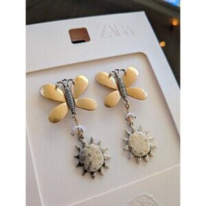 ZARA Earrings Butterfly Sun Contrast Gold Silver Tone Drop Whimsy Statement NEW