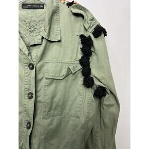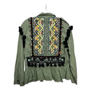 ZARA Embellished Jacket Medium Olive Green Boho Festival Beaded Pom Pom