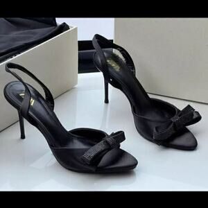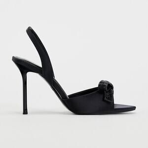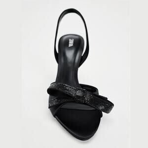 Elegant ZARA embellished slingback heels featuring a sleek satin-effect fabric and a striking oversized front bow encrusted with tonal micro-crystals. High heel silhouette with a slim slingback strap that secures comfortably at the back. Modern open-toe front with a structured footbed and sculpted stiletto heel for a refined, dressy finish. A sold-out blogger-favorite style—perfect for weddings, evenings out, holiday events, and cocktail looks. New with tags.