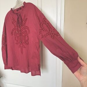 ZARA Embroidered Blouse Eyelet Long Sleeve Ruffle Trim Size Oversized XS