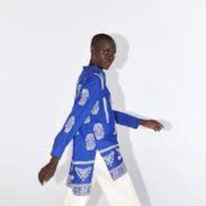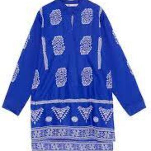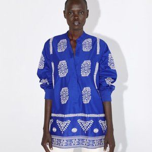 ZARA Embroidered Cotton Tunic Hi Lo Hem Blue with White Sz L/XL