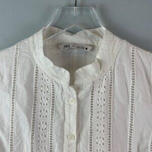 Zara Cutwork Embroidery detail, lining, flared hem and button fastening at the front, Mini Shirt Dress in white.