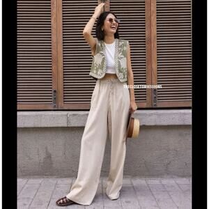 Khaki open front waistcoat. Embroidered detail. From ZARA, in size M and L. New with tags.