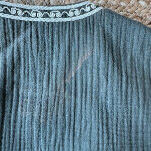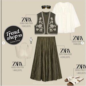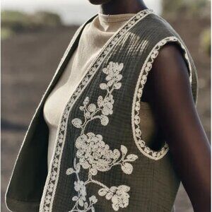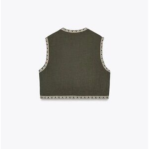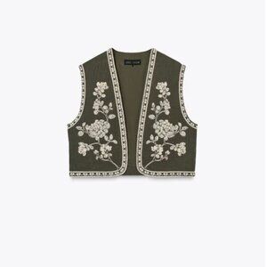ZARA Embroidered Waistcoat – Size M (Ref. 6318/042/505) Beautiful embroidered vest from ZARA, size M. Green textured cotton fabric with white floral embroidery on the front. Color: Khaki green with white embroidery 📌 Note: The vest is in very good condition overall, but it has a faint discoloration mark on the back (shown in the close-up photos). The flaw is subtle and not very noticeable when worn. Fabric: Outer shell: 100% cotton Lining: 83% polyester, 17% cotton Details: Boho-inspired textured fabric White floral embroidery on both sides Trimmed edges Open front Slight defect on the back — fully shown in photos Perfect for layering over dresses, tops, jeans. #zara #zarawomen #zarastyle #zaraoutfit #bohostyle #bohochic #embroideredvest #vest #gilet #greenvest #boutique #chicstyle #fashionfinds #poshfinds #poshmarkstyle #sizeM #midsizefashion #bohovibes