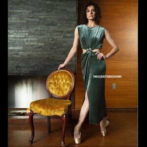 💚 **Effortlessly elegant.** This **ZARA Emerald Cut Out Midi Dress** blends modern sophistication with sculptural detail — featuring gathered ruching, a waist cutout with gold buckle accent, and a fluid drape that flatters every curve. Perfect for evening events, special occasions, or a refined cocktail look.