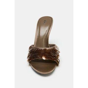 Stiletto heel sandal. Wide strap on the front with sequin details. Round toe.