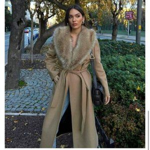 ZARA FAUX FUR COLLAR BELTED COAT TAN