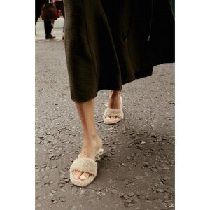 Faux fur sandals. Front strap. Kitten heel. Round toe. Heel height: 6 cm