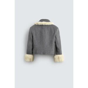 Cropped fit jacket made in a fabric with 50% wool. Lapel collar finished with contrast faux fur fabric. Cropped long sleeves finished in cuffs with contrast faux fur fabric. Front button fastening with buttons covered in the same fabric.