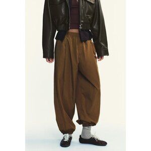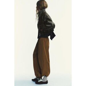 Short jacket with a high collar. Long sleeves with shoulder tabs. Front flap pockets. Front zip fastening and snap-button placket.