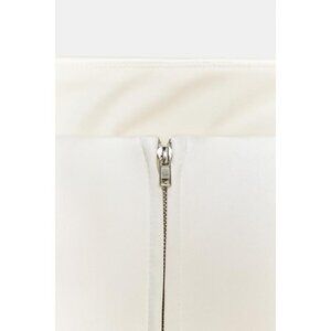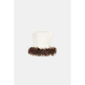 Straight neck off-the-shoulder top. Hem with contrasting feather appliqué. Back metal zip closure.