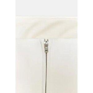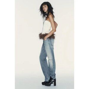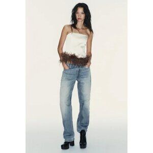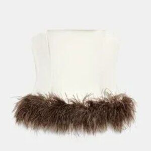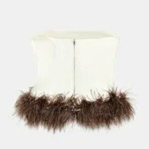 Straight neck off-the-shoulder top. Hem with contrasting feather appliqué. Back metal zip closure.