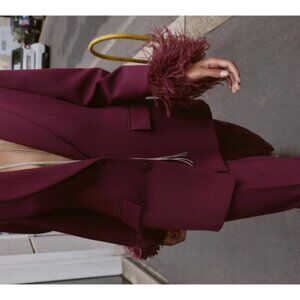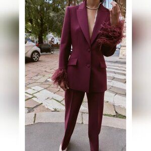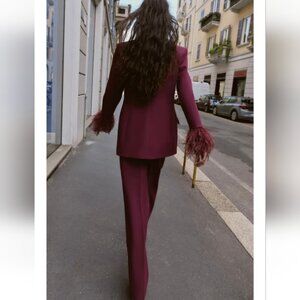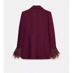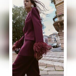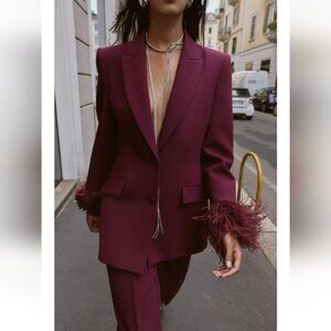 Fitted blazer with a lapel collar and long sleeves with shoulder pads finished with feathers. Front flap pockets . Front button closure in matching color.