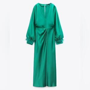 ZARA FEATHERED SATIN EFFECT MIDI DRESS