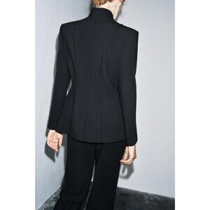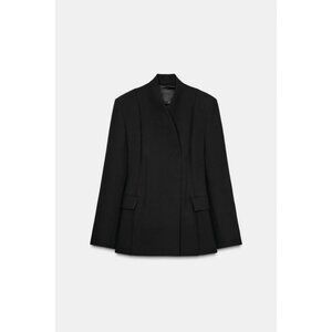 Fitted blazer with a high neck and long sleeve. Flap pockets on the front. Tonal inner lining. Front button fastening.