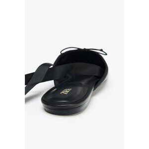 Slingback ballet flats. Bow and gathered detail on the front. Ankle tie fastening. Square toe.
