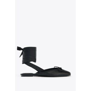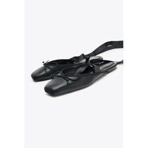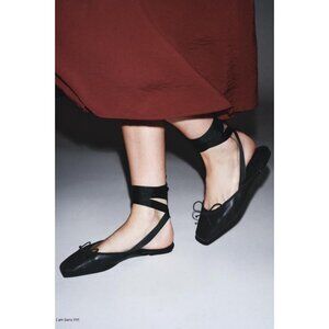 Slingback ballet flats. Bow and gathered detail on the front. Ankle tie fastening. Square toe.