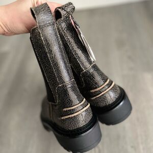 Flat ankle boots in leather. Side elastic goring. Front and back pull tab. Lug soles. Rounded toe.