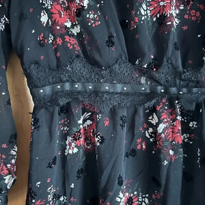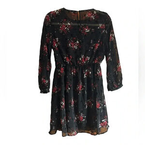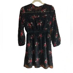 Pre owned excellent condition. Adorable black long sleeve floral print dress with lace detailing at waist. WOMENS size small.