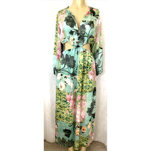 ZARA FLORAL PRINT CUT OUT DRESS Maxi Blue Green Long Sleeve V Neck Slit S