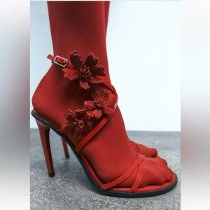 Heeled sandals. Beaded flower shaped detail. Thin strap at front. Thin heel.