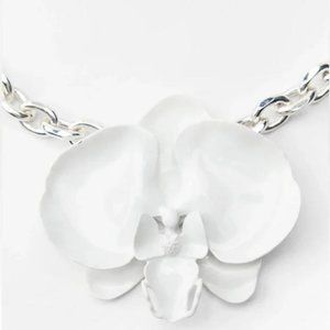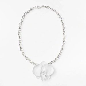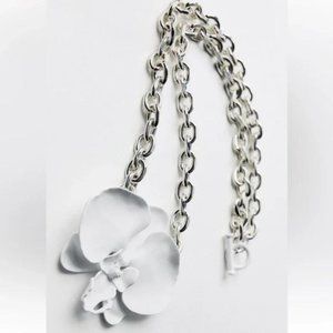 Metal link necklace with raised flower shape charm. Contrast toggle closure.