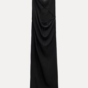 Midi dress with asymmetric neckline and thin straps. Open back.