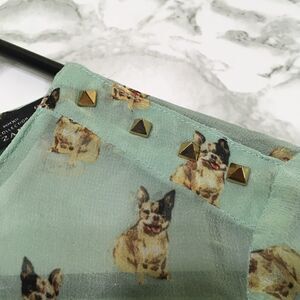 ZARA FRENCH BULLDOG PRINT NOVELTY SHEER CHIFFON STUDDED SHOULDER MINT BLOUSE S