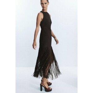 Round neck dress with sleeveless design. Featuring a back vent detail and a fringed hem.