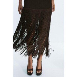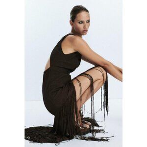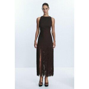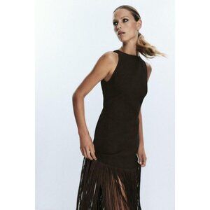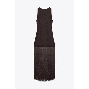 Round neck dress with sleeveless design. Featuring a back vent detail and a fringed hem.