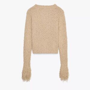Round neck, long sleeve jacket with fringe trim. Concealed front hook closure.