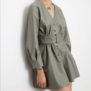 Short V-neck dress with long sleeves with pleated cuffs. Side hidden in-seam pockets. Self-belt with fabric-covered buckle. Front closure with lined buttons.