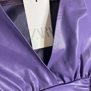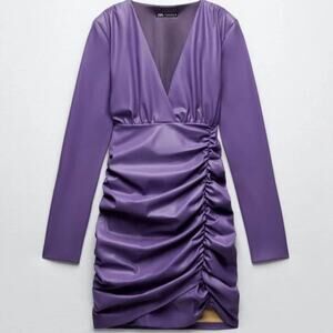 This stunning ZARA faux leather dress is brand new with tags and ready to turn heads! It features a flattering wrap front style with a v-neck plunge, accentuated by delicate light shoulder pads. The overall feminine ruching adds a touch of elegance, while the inner lining ensures all-day comfort.