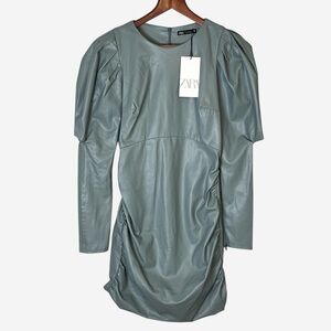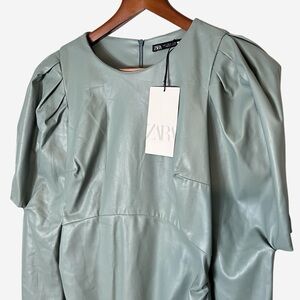 ZARA Faux Leather Mini Dress Puff Sleeve Zip Wrist Green Blogger Fave